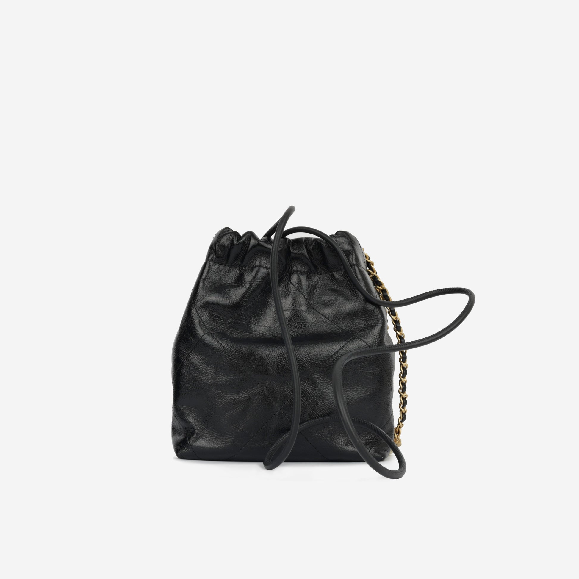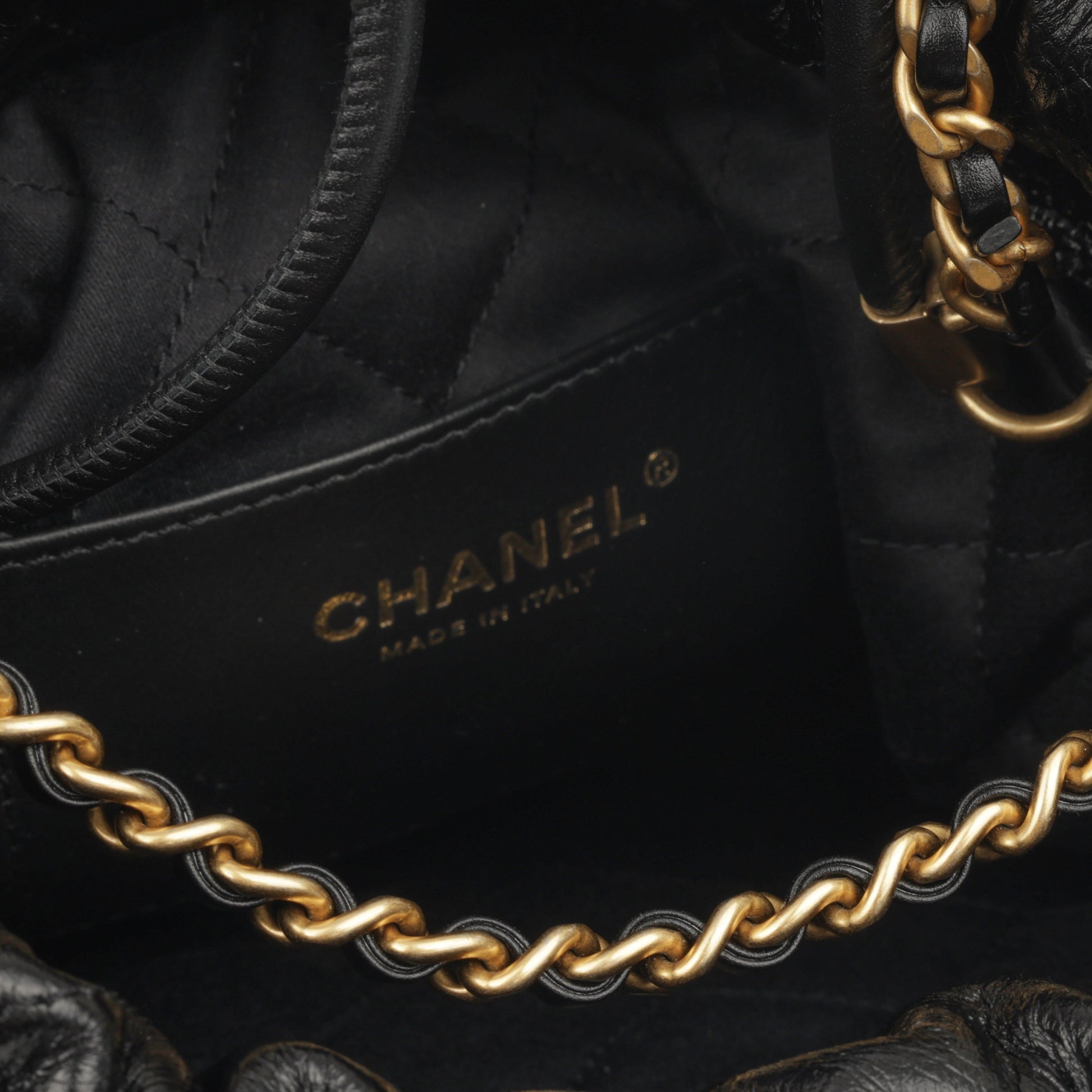Carefully crafted from shiny crumpled calfskin leather, Chanel presents their 22 Mini. The chicest item for the lady that wants to carry everything around with them, this bag features Chanels classic interwoven back straps along with top handles to carry it handheld. This piece from 2023 is a well worthy addition to any luxury handbag collection.