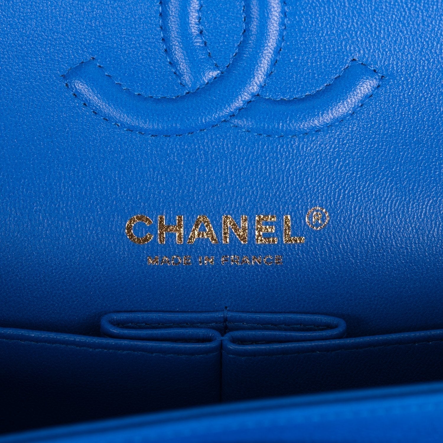 This Small Classic Double Flap bag is in blue caviar leather with light gold tone hardware and features a front flap with signature CC turnlock closure, half moon back pocket, and adjustable interwoven light gold tone chain link and blue leather shoulder strap.