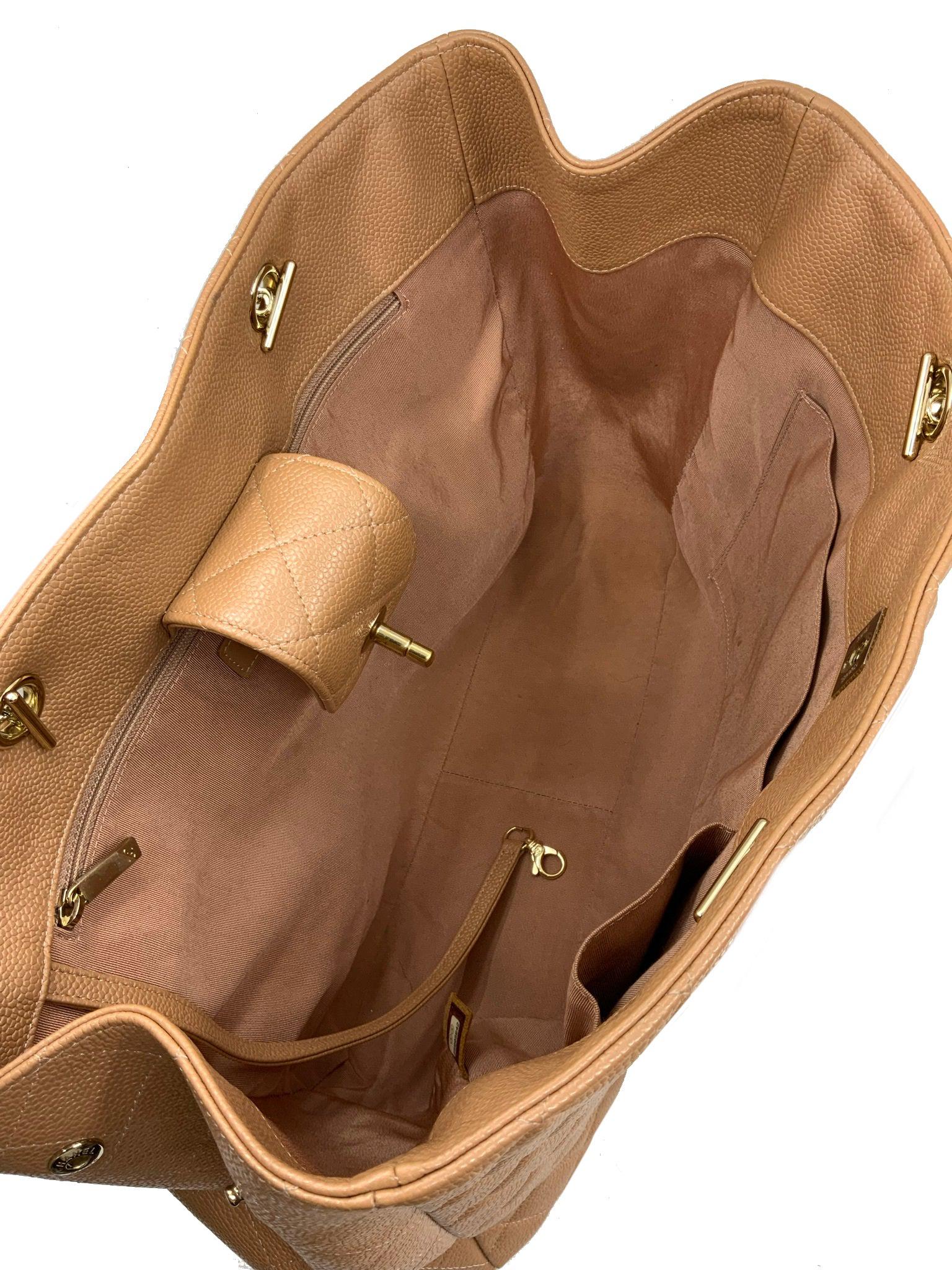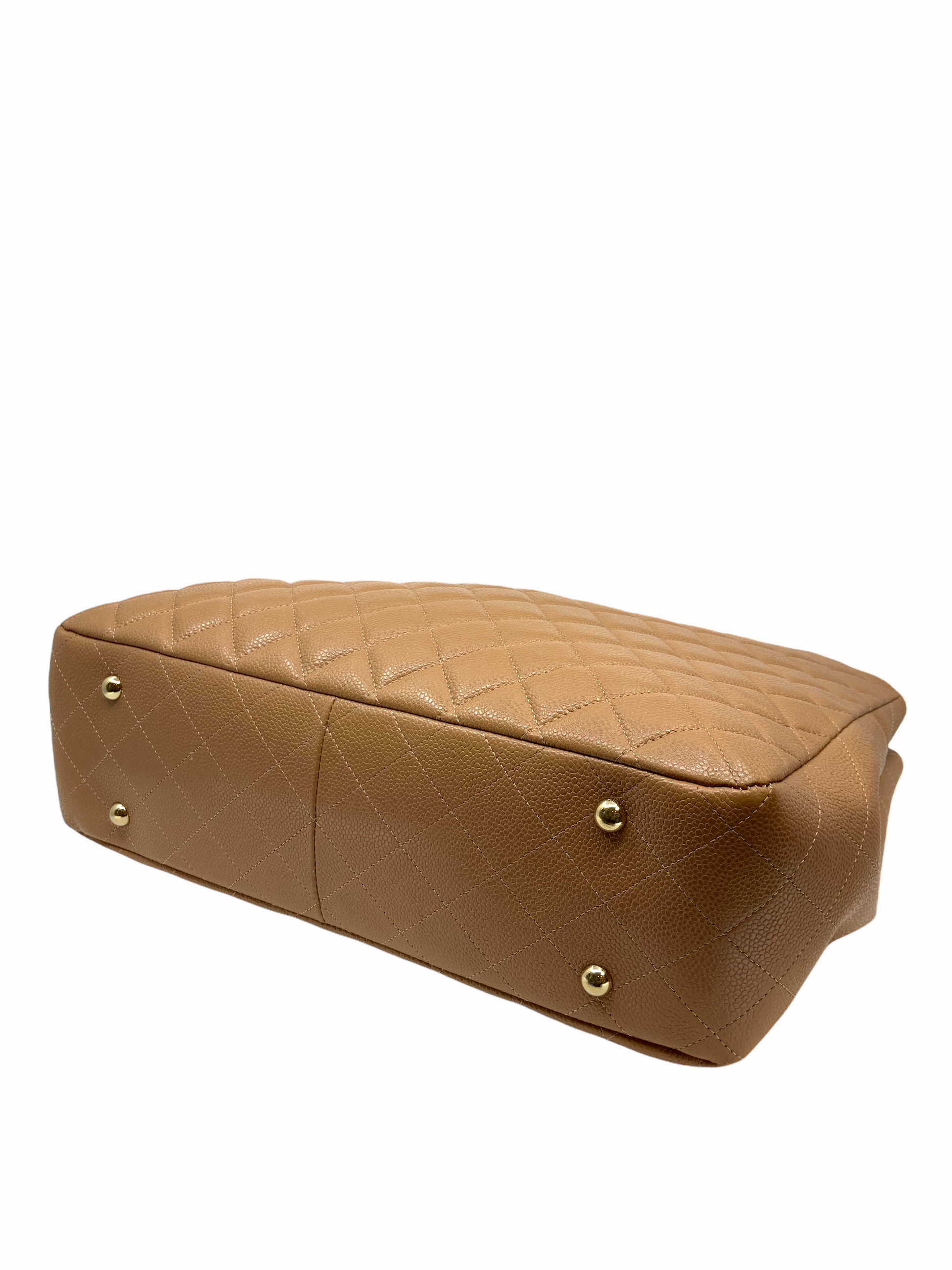This absolutely gorgeous Chanel Calfskin Quilted Large CC Shopping Tote from the 2018 Collection crafted from signature diamond quilted camel caviar leather and gold-tone hardware. This chic and functional bag is a more current style and features dual chain link straps threaded with elegant leather with an ultra-comfortable leather shoulder pad. The top-center leather flap-tab includes a secure 'CC' turn-lock closure that opens to a spacious interior finely lined in tonal fabric with a zipper and two patch pockets.