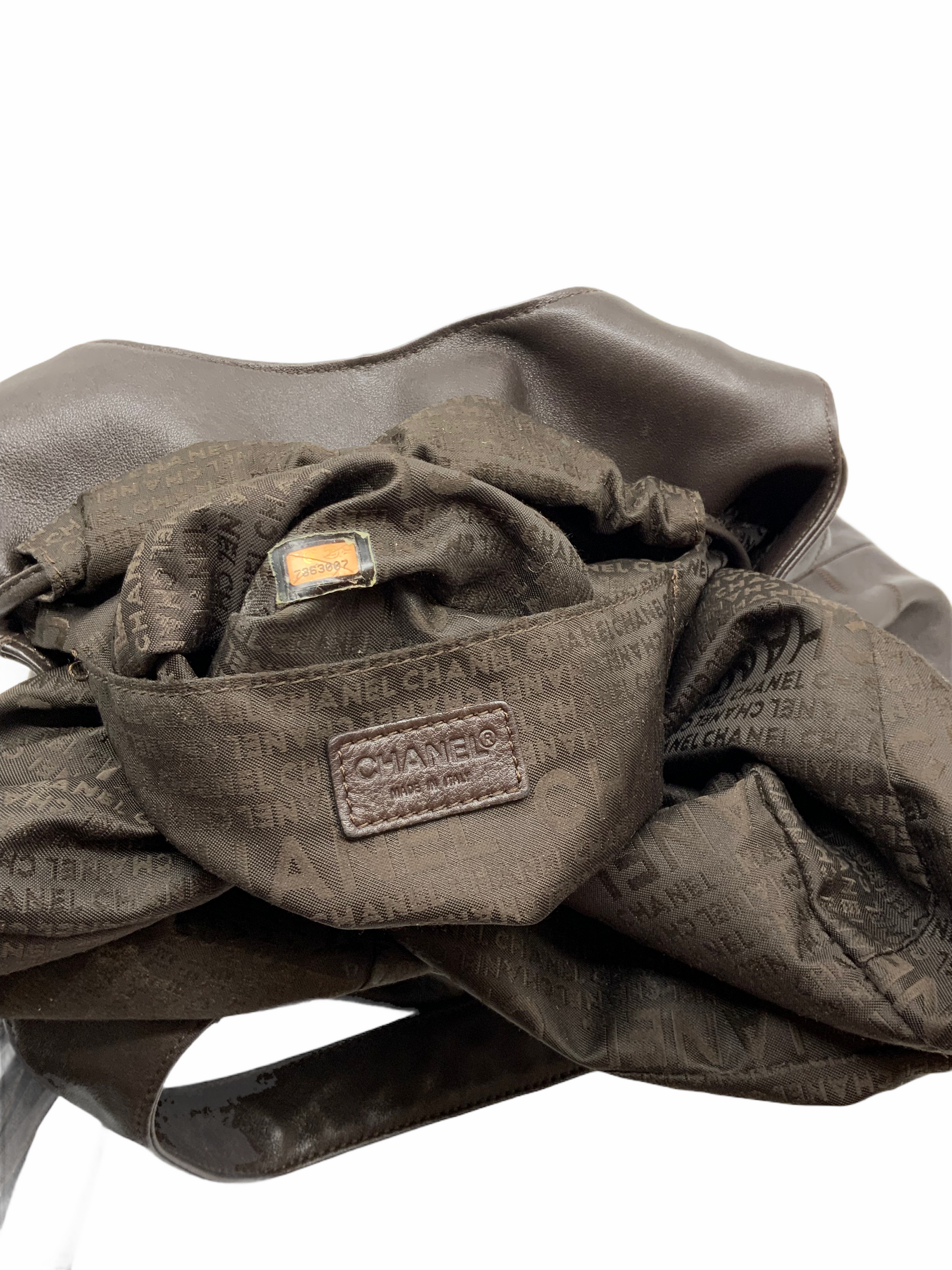 CHANEL Calfskin Square Stitched Tassel Hobo which makes for the perfect everyday carry-all. Beautifully crafted from chocolate brown square quilted calfskin leather and silver-tone hardware. Featuring dual flat leather looping shoulder straps and a signature 'CC' logo-engraved cinch drawstring tassel closure.