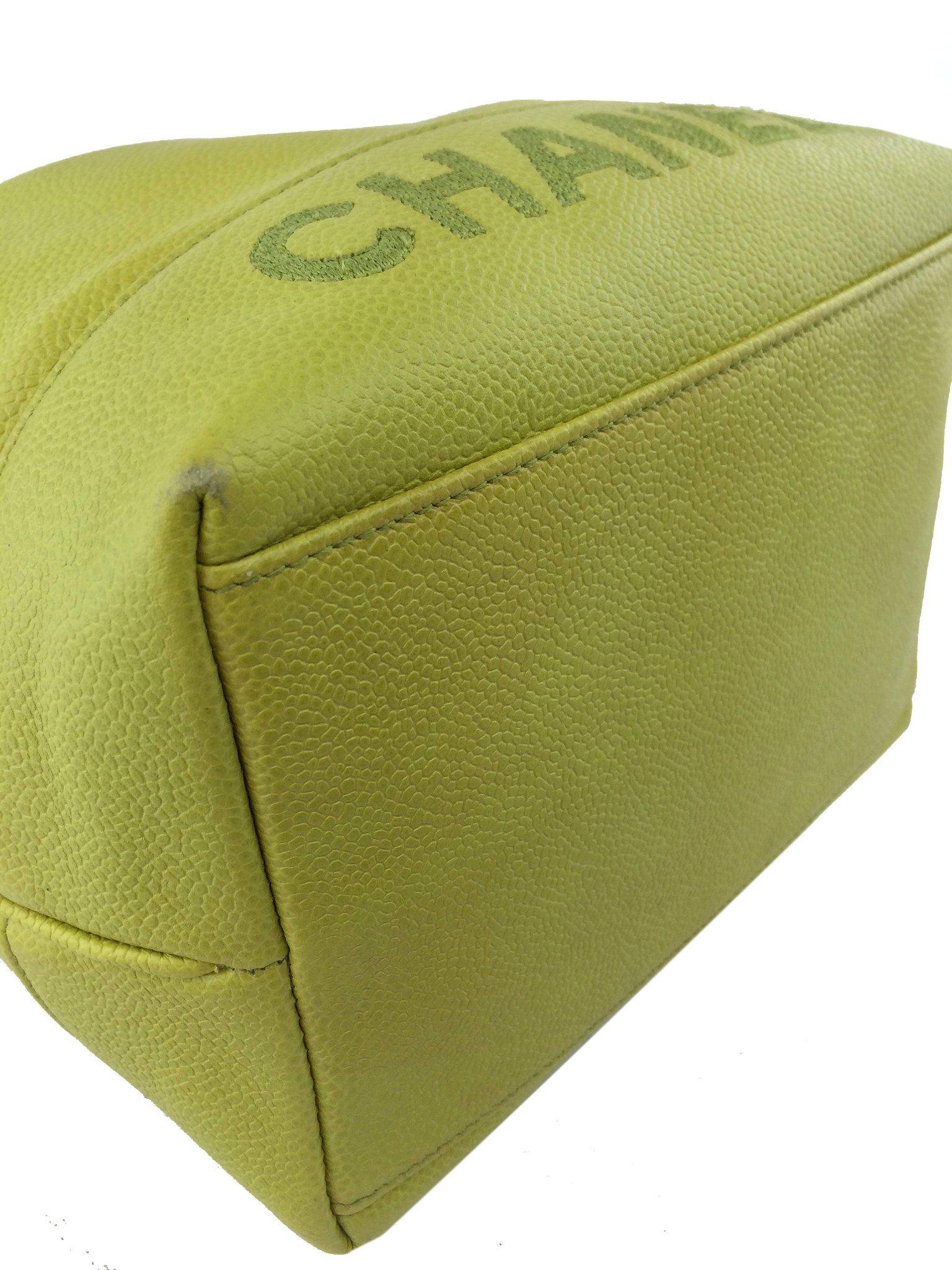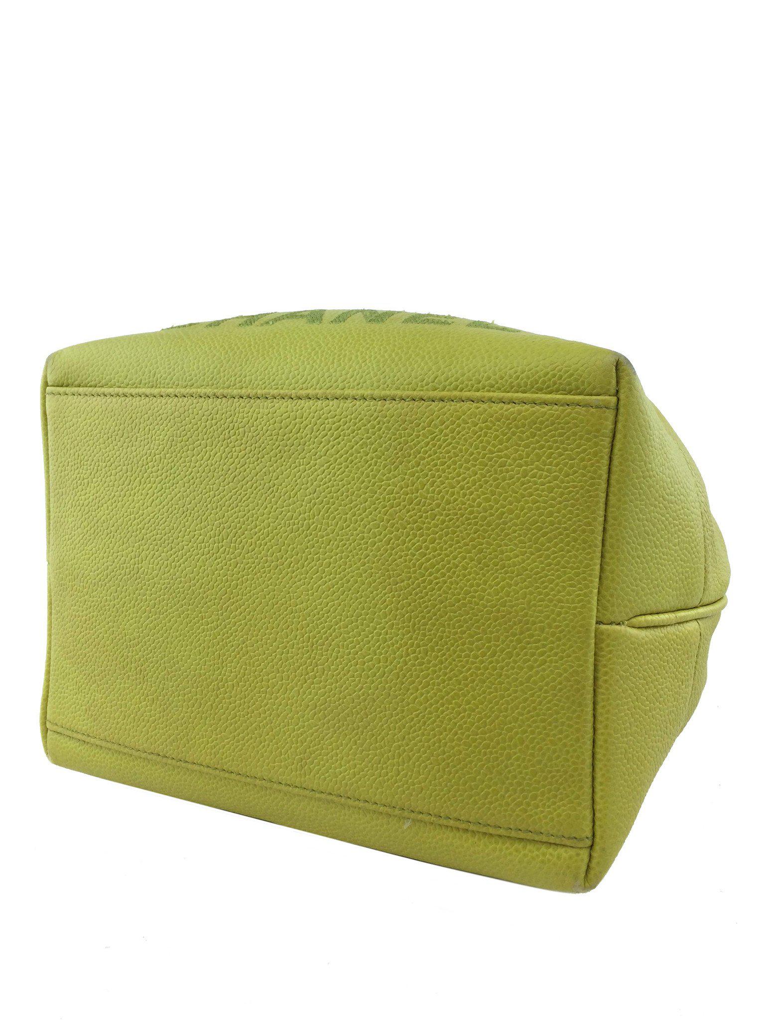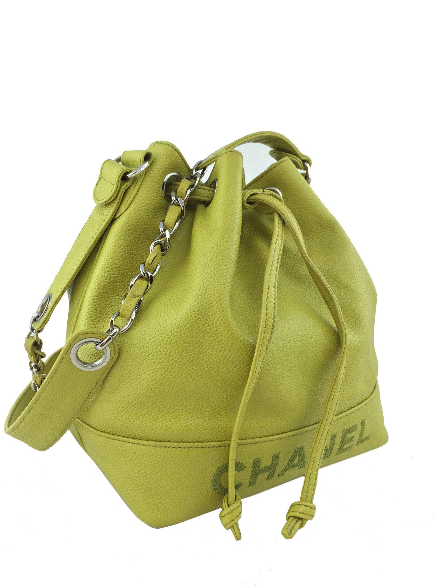 Chanel Caviar Leather Drawstring Bucket Bag crafted in Chanel's classic bright yellow caviar leather. Featuring front and rear signature logo's, silver-tone hardware and a chain link strap with a comfortable leather shoudler pad. The secure drawstring closure opens to a spacious interior with a hanging pochette.