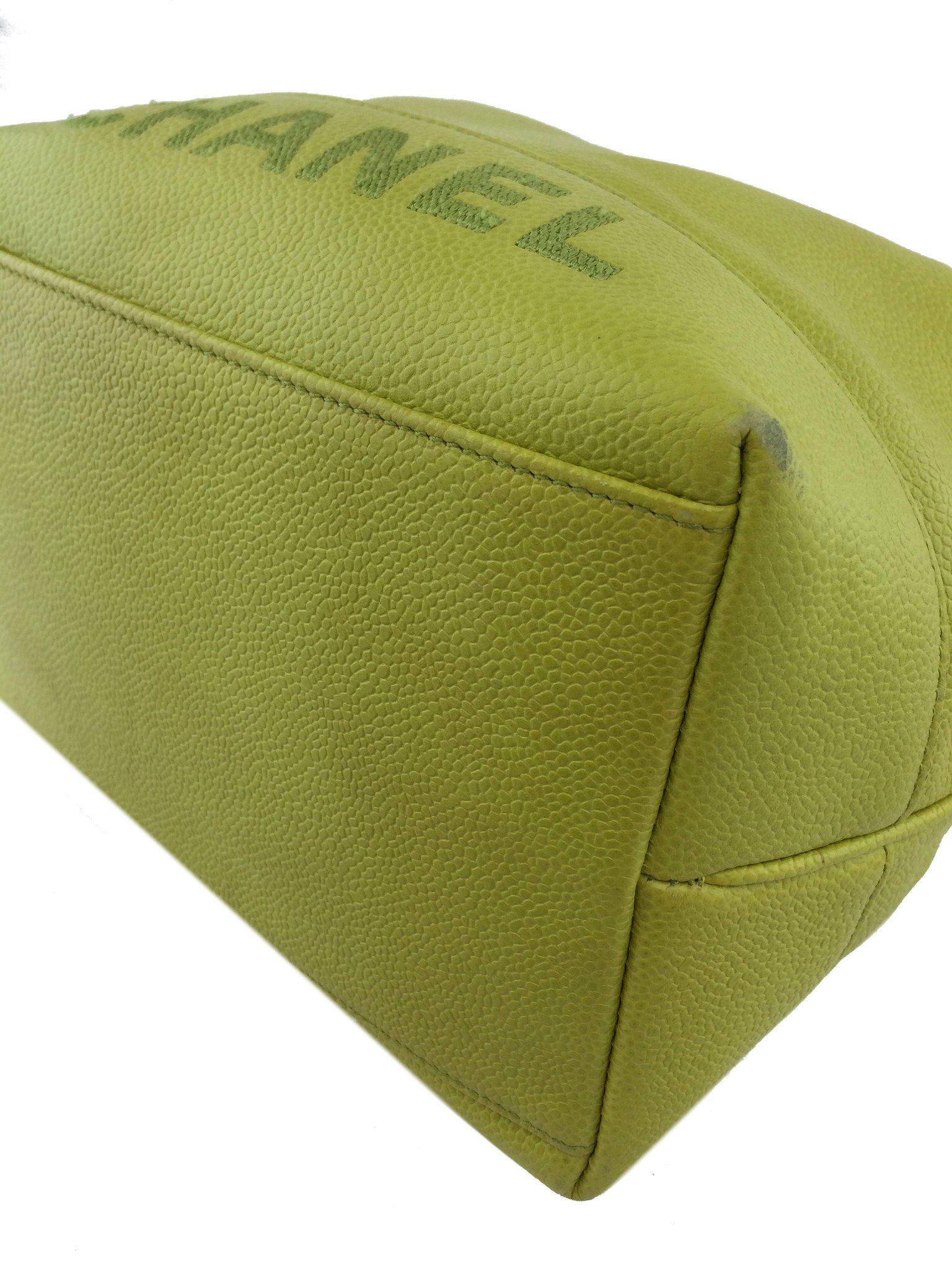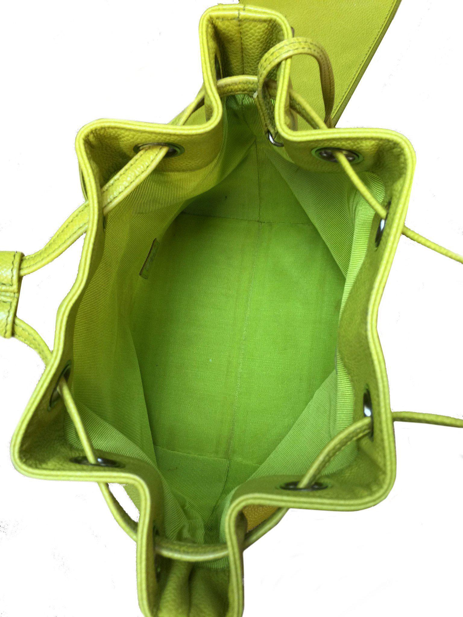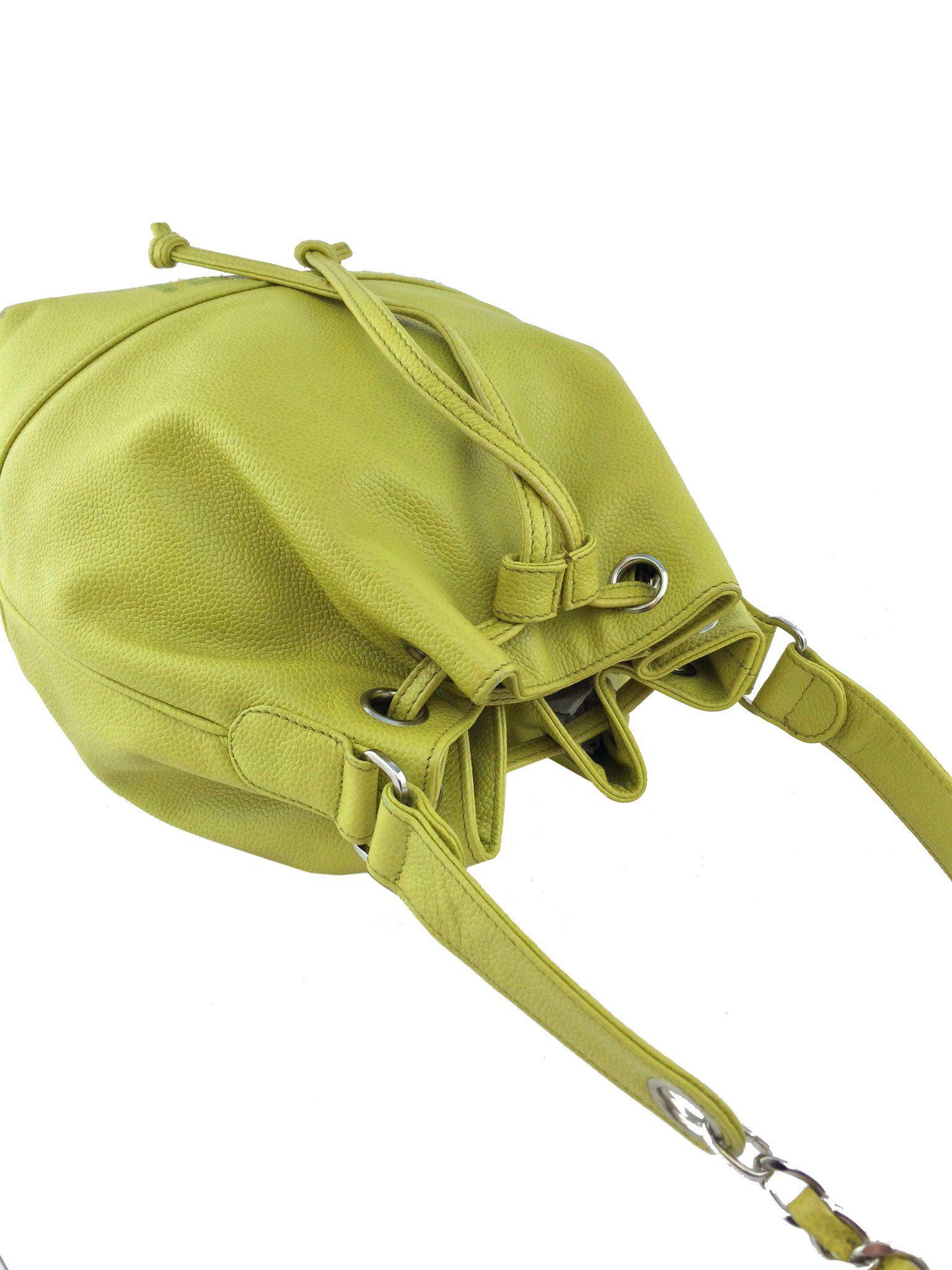 Chanel Caviar Leather Drawstring Bucket Bag crafted in Chanel's classic bright yellow caviar leather. Featuring front and rear signature logo's, silver-tone hardware and a chain link strap with a comfortable leather shoudler pad. The secure drawstring closure opens to a spacious interior with a hanging pochette.