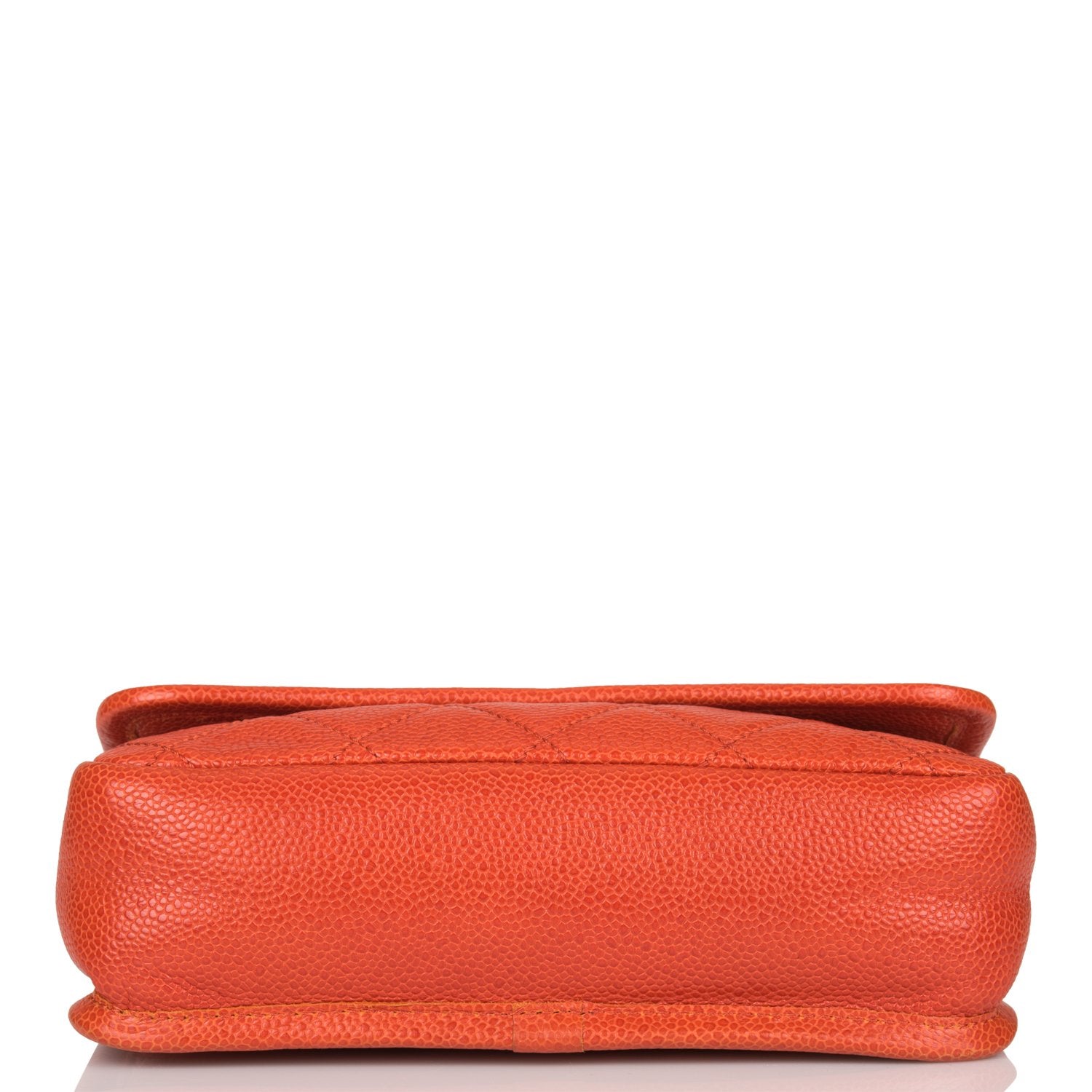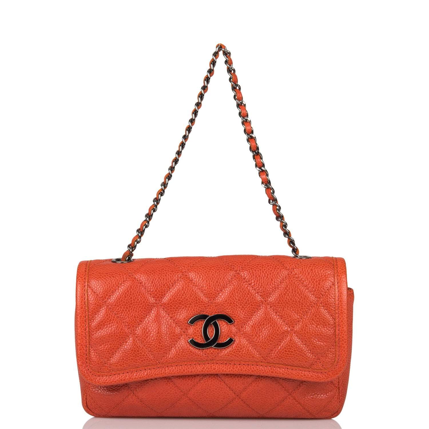 This Seasonal Mini flap bag is of dark orange caviar leather with ruthenium hardware and has a front flap with signature CC logo, rear slip pocket, single interwoven dark orange leather and ruthenium chain link shoulder/crossbody strap.