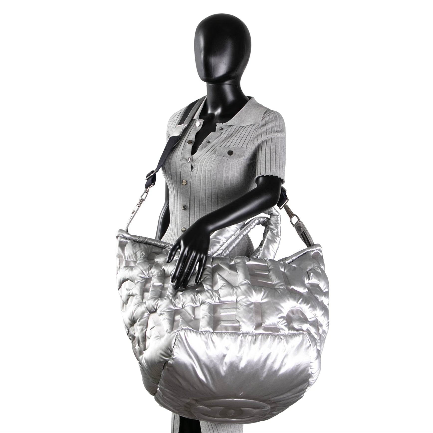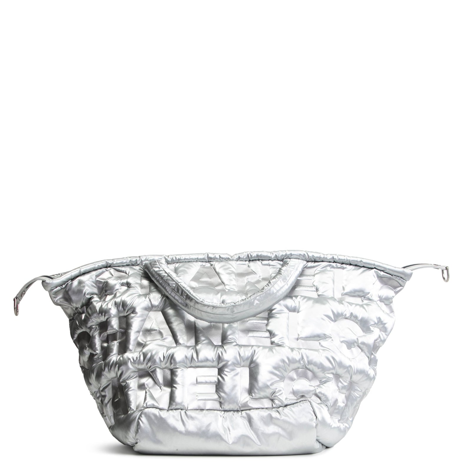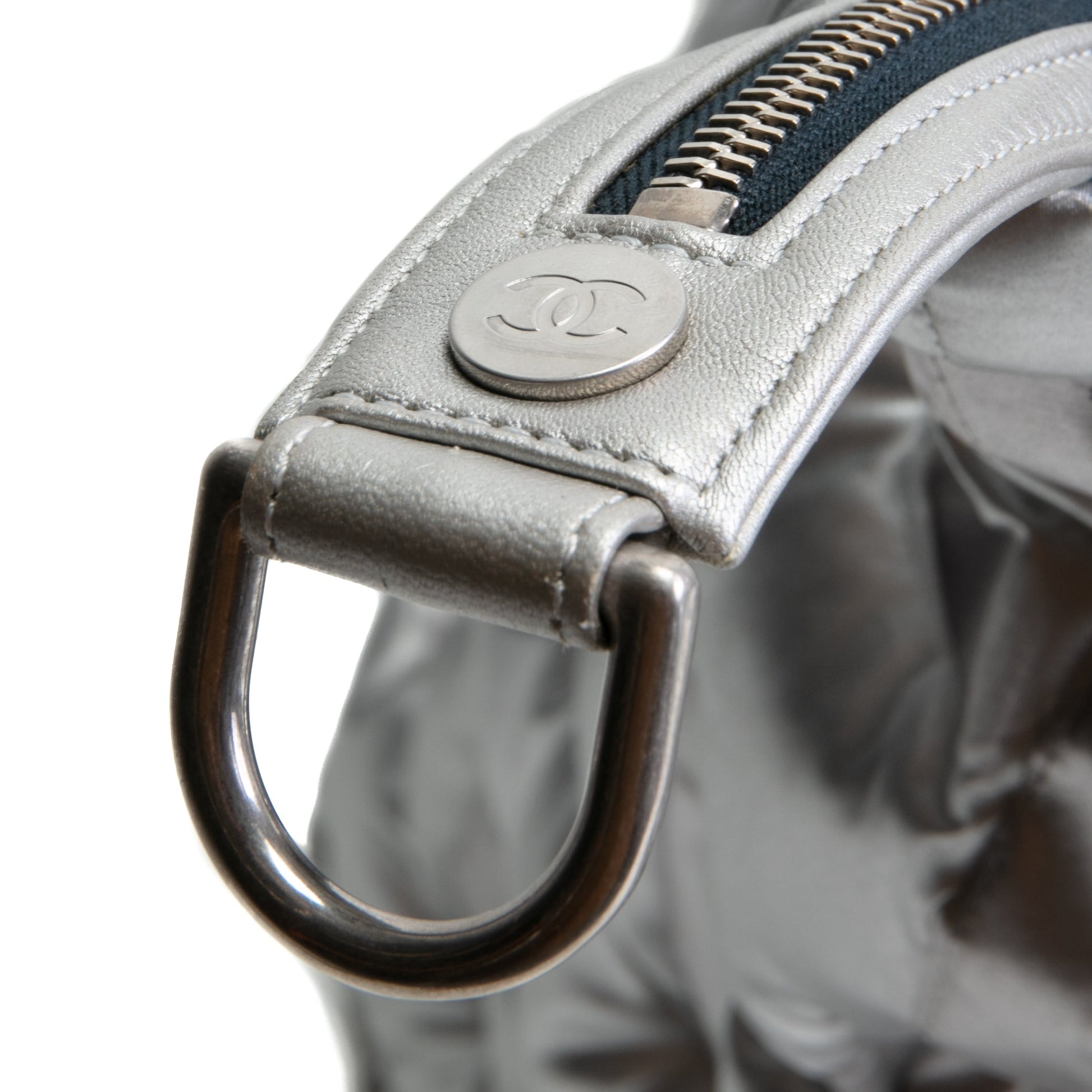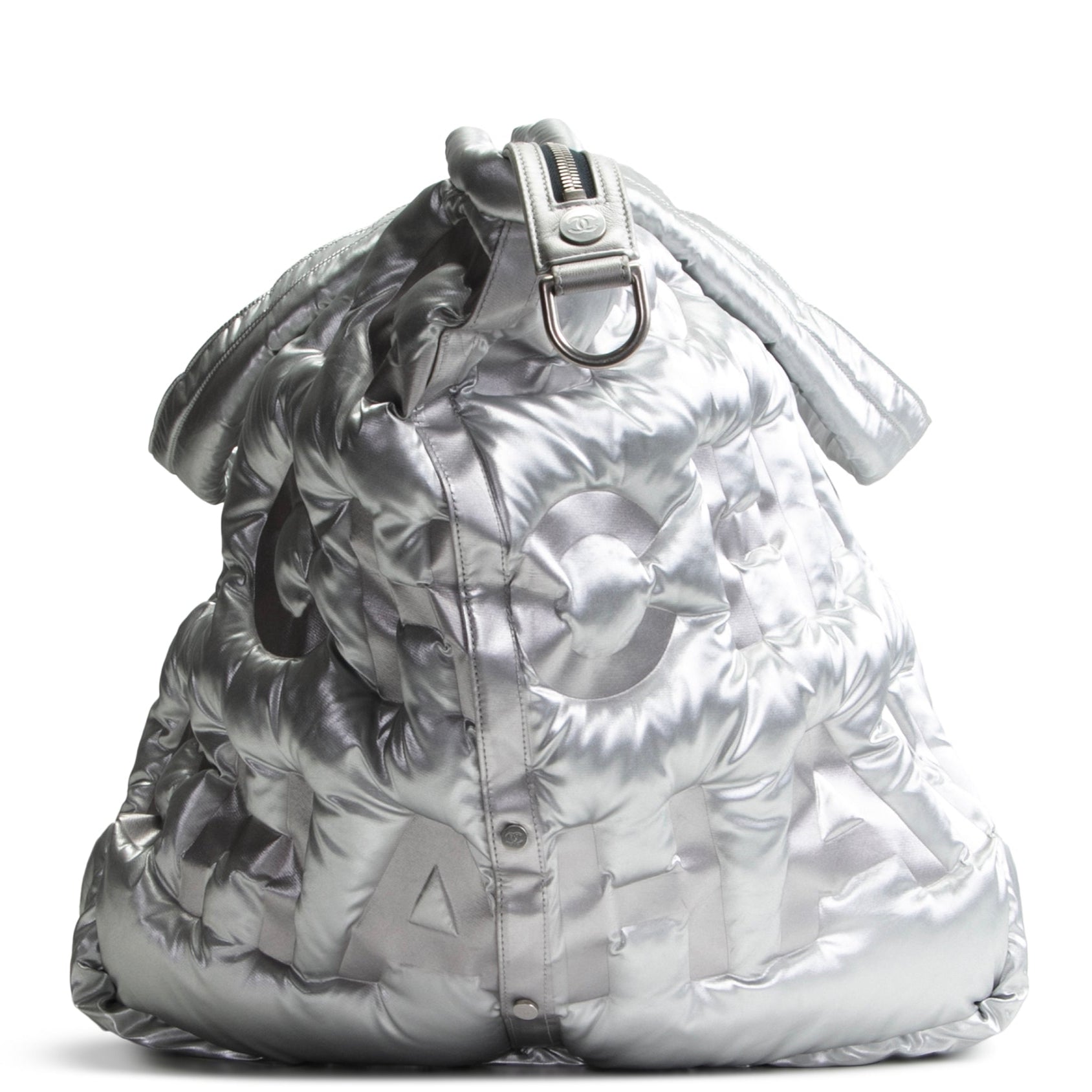 - Authentic Chanel Doudoune Tote Embossed Nylon Large- Metallic Silver