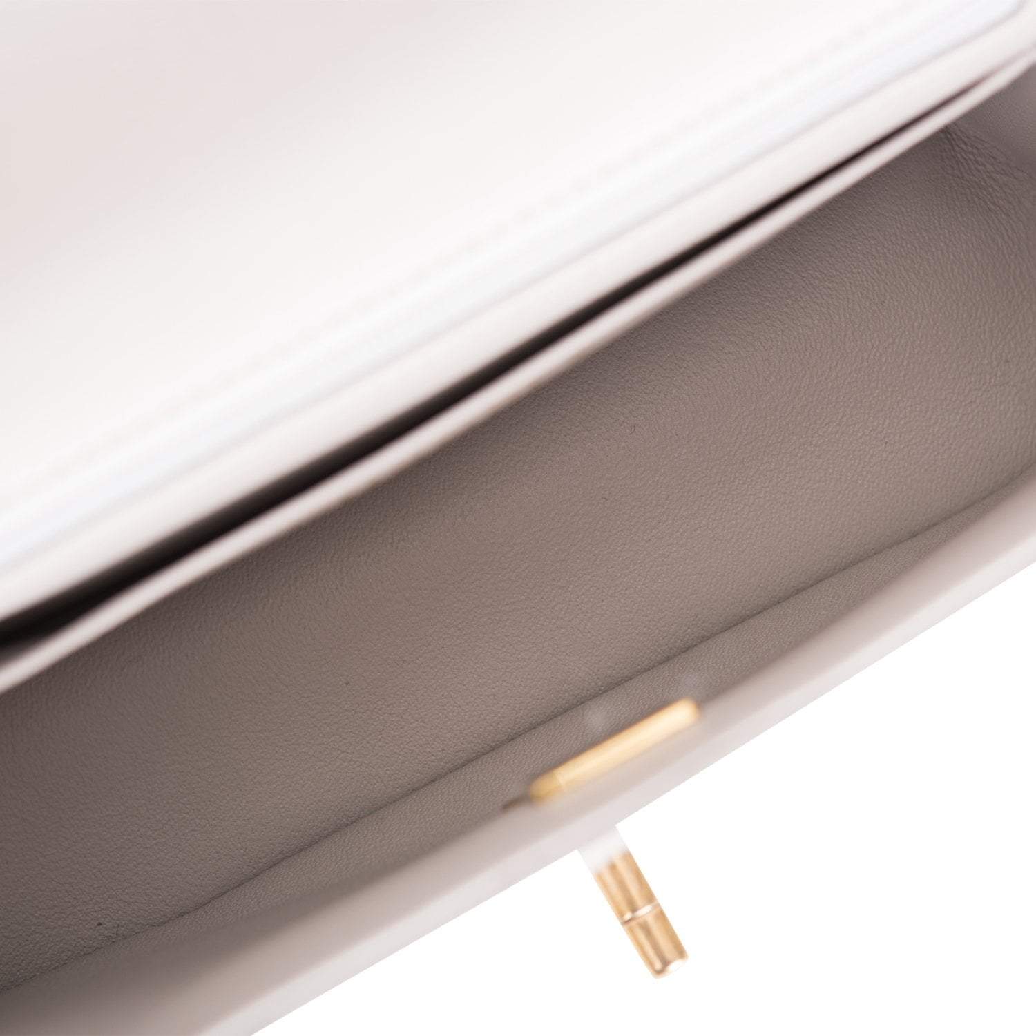 This Mini Rectangular flap bag is in grey lambskin with antique gold-tone hardware and has a front flap with signature CC turn-lock closure, rear half moon pocket, top handle, and single interwoven grey leather and antique gold tone chain link shoulder/crossbody strap.