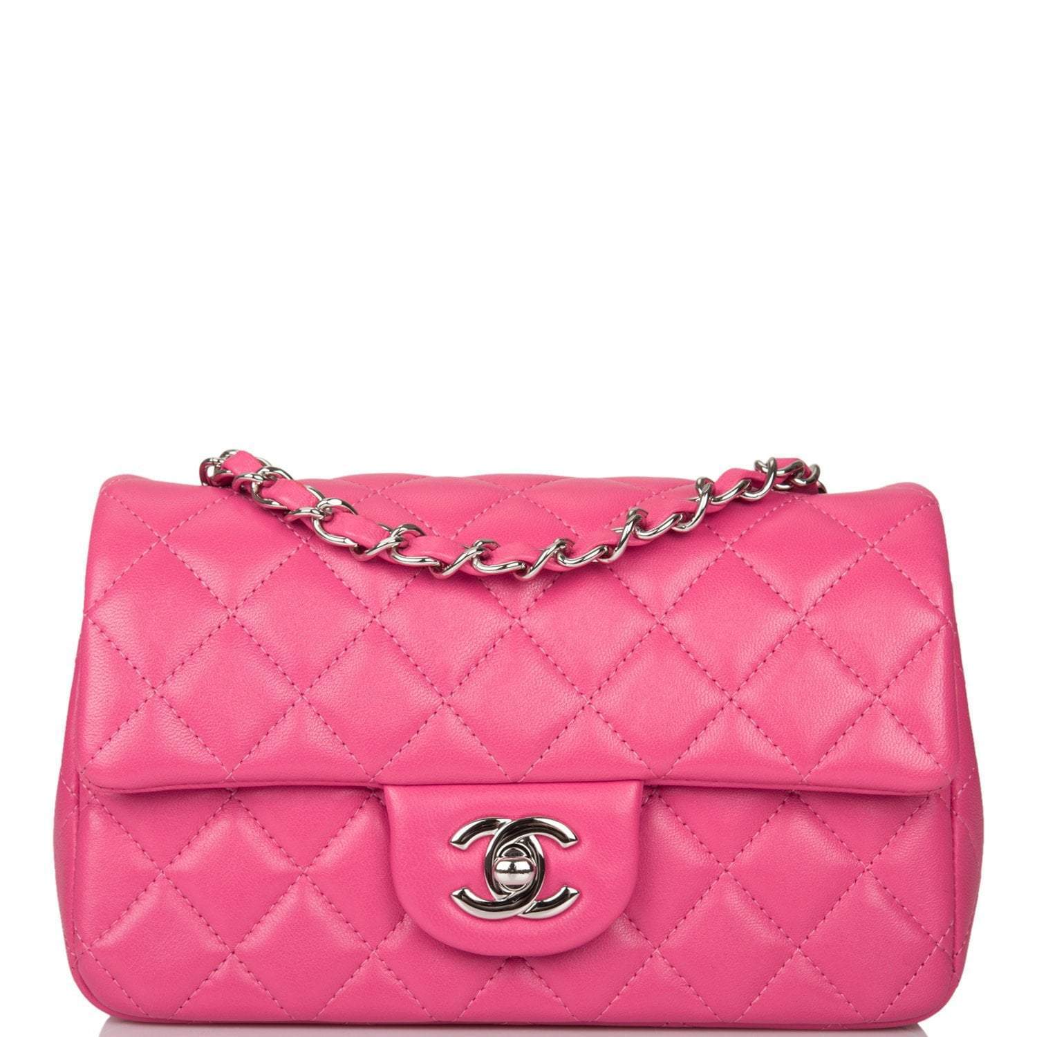 This Mini Rectangular flap bag is of pink lambskin leather with silver tone hardware and has a front flap with signature CC turnlock closure, rear half moon pocket, single interwoven pink leather and silver tone chain link shoulder/crossbody strap.