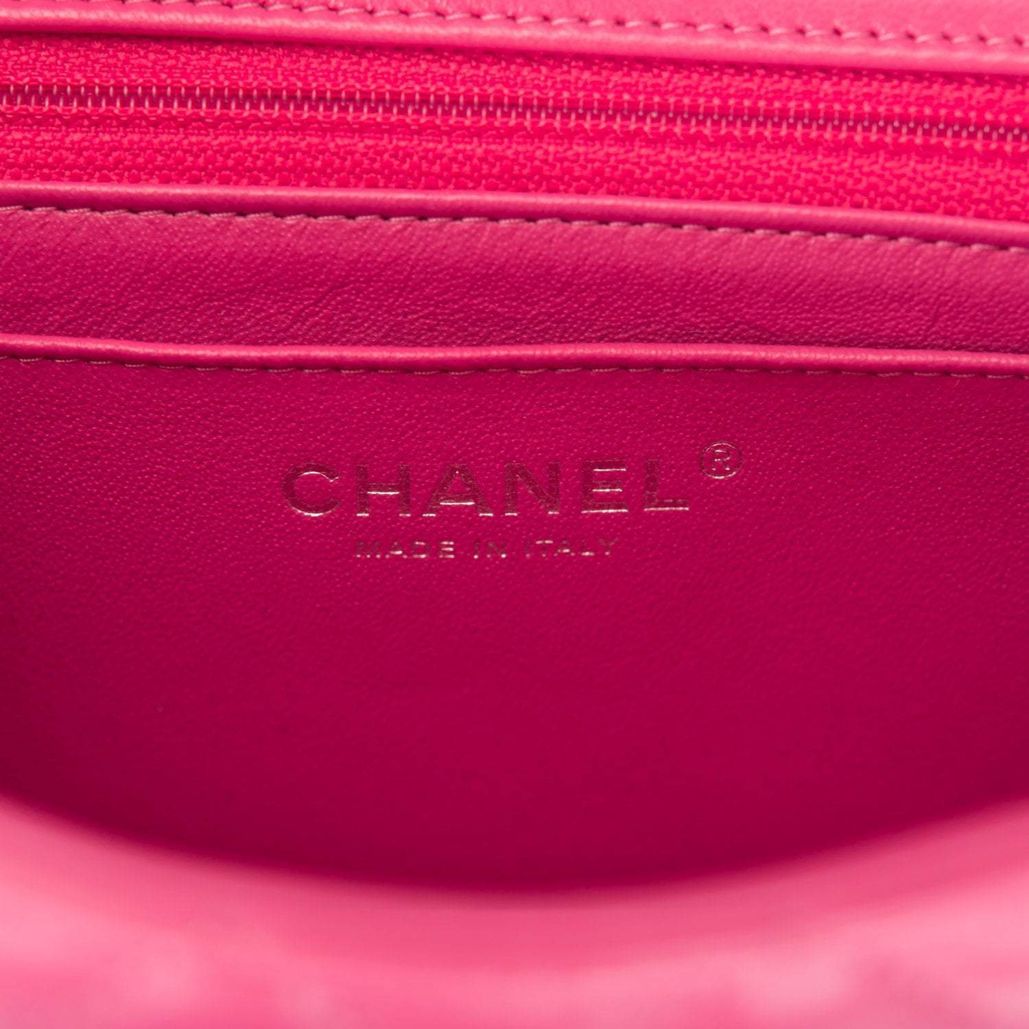 The interior is lined in pink leather and features a zipper pocket with Chanel pull and an open pocket below.