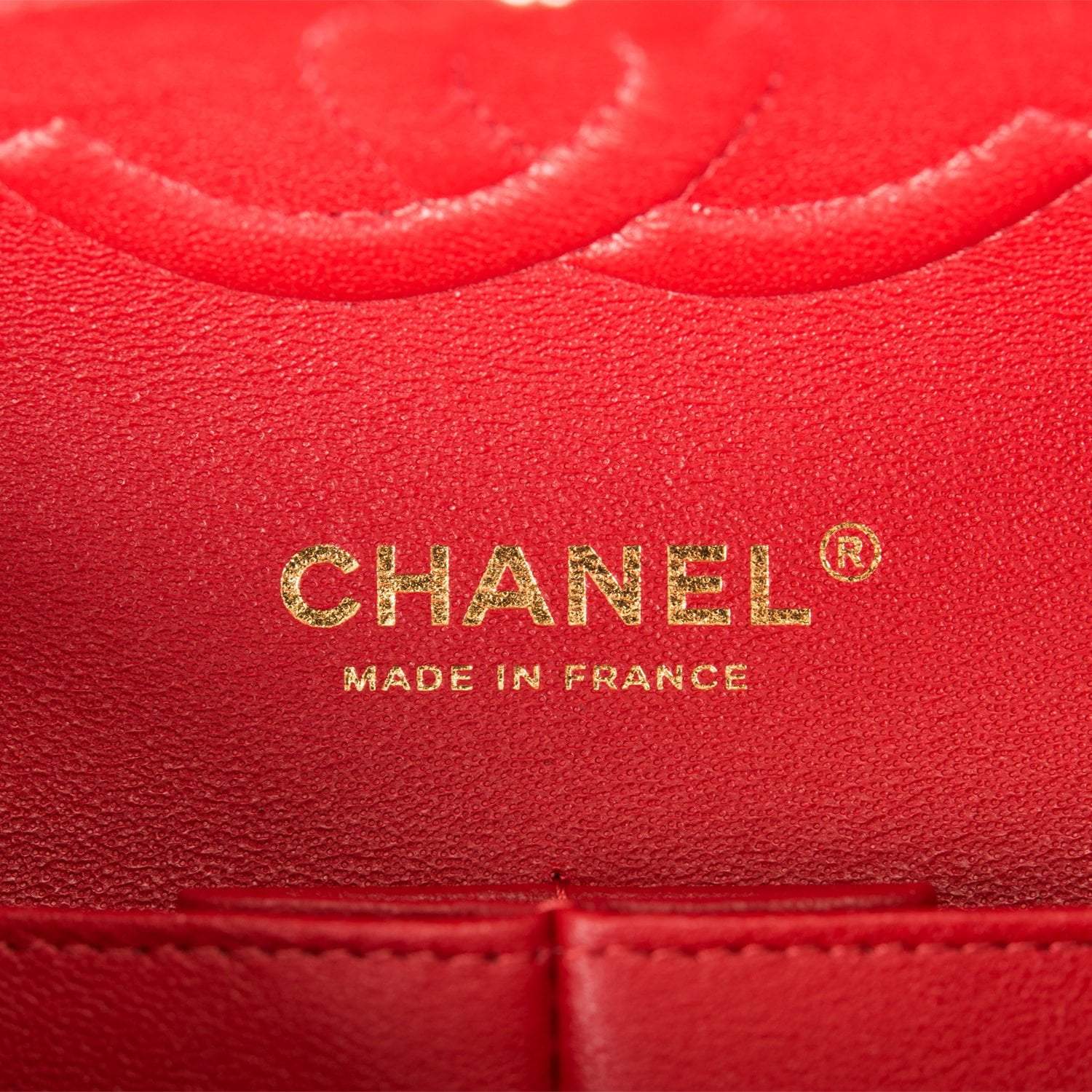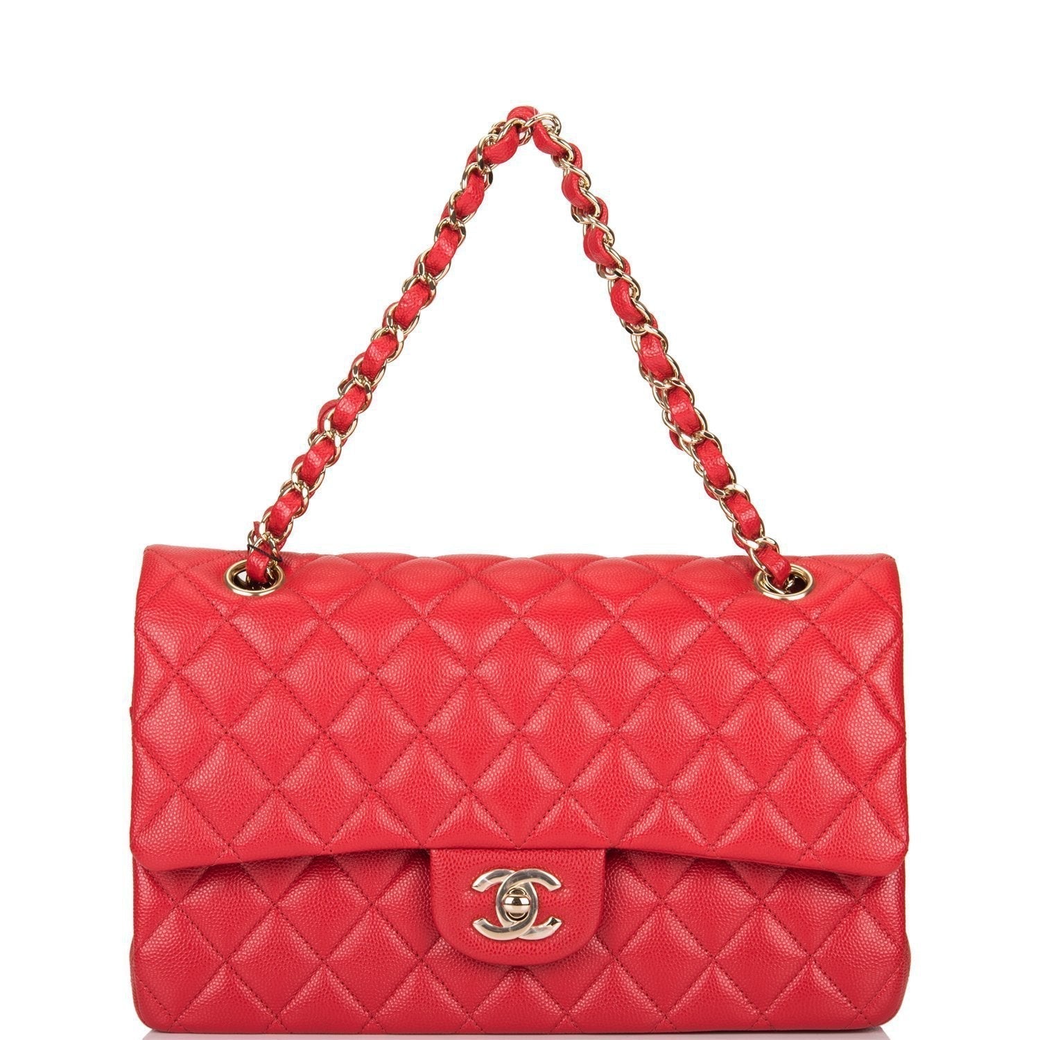 Chanel Medium Classic double flap bag of red quilted caviar leather with light gold tone hardware.
