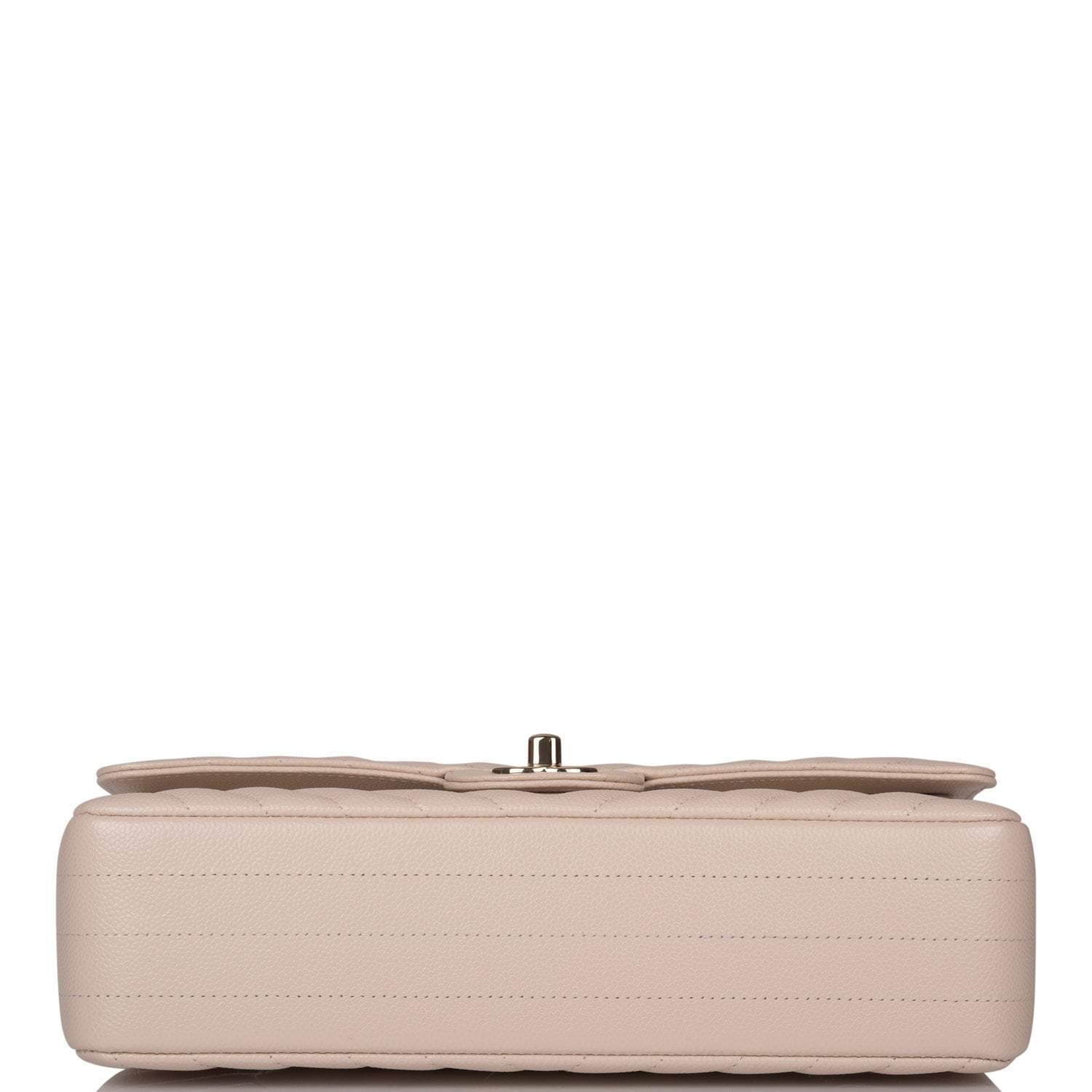 Chanel Shiny Beige Chevron Caviar Medium Classic Double Flap Bag Light Gold Hardware