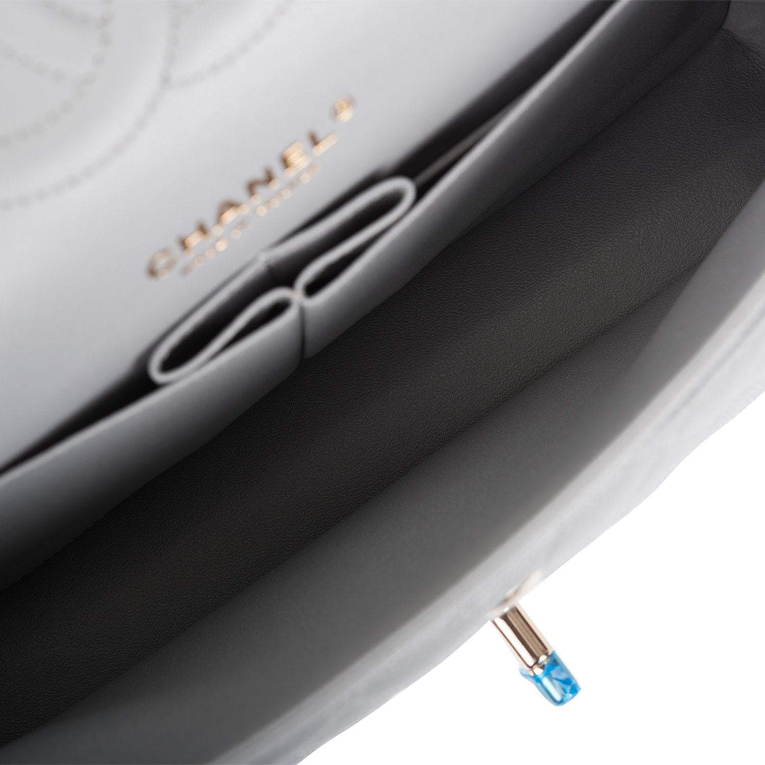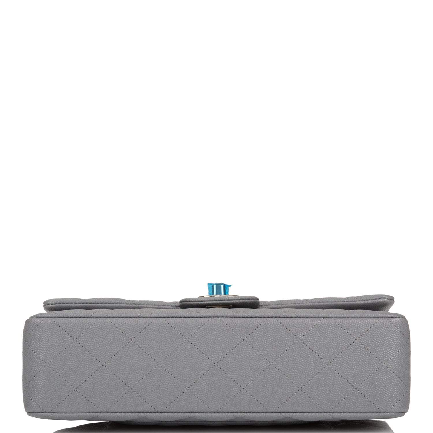 This Medium Classic Double Flap bag is in shiny grey caviar leather with light gold tone hardware and features a front flap with signature CC turnlock closure, half moon back pocket, and adjustable interwoven light gold tone chain link and grey leather shoulder strap.