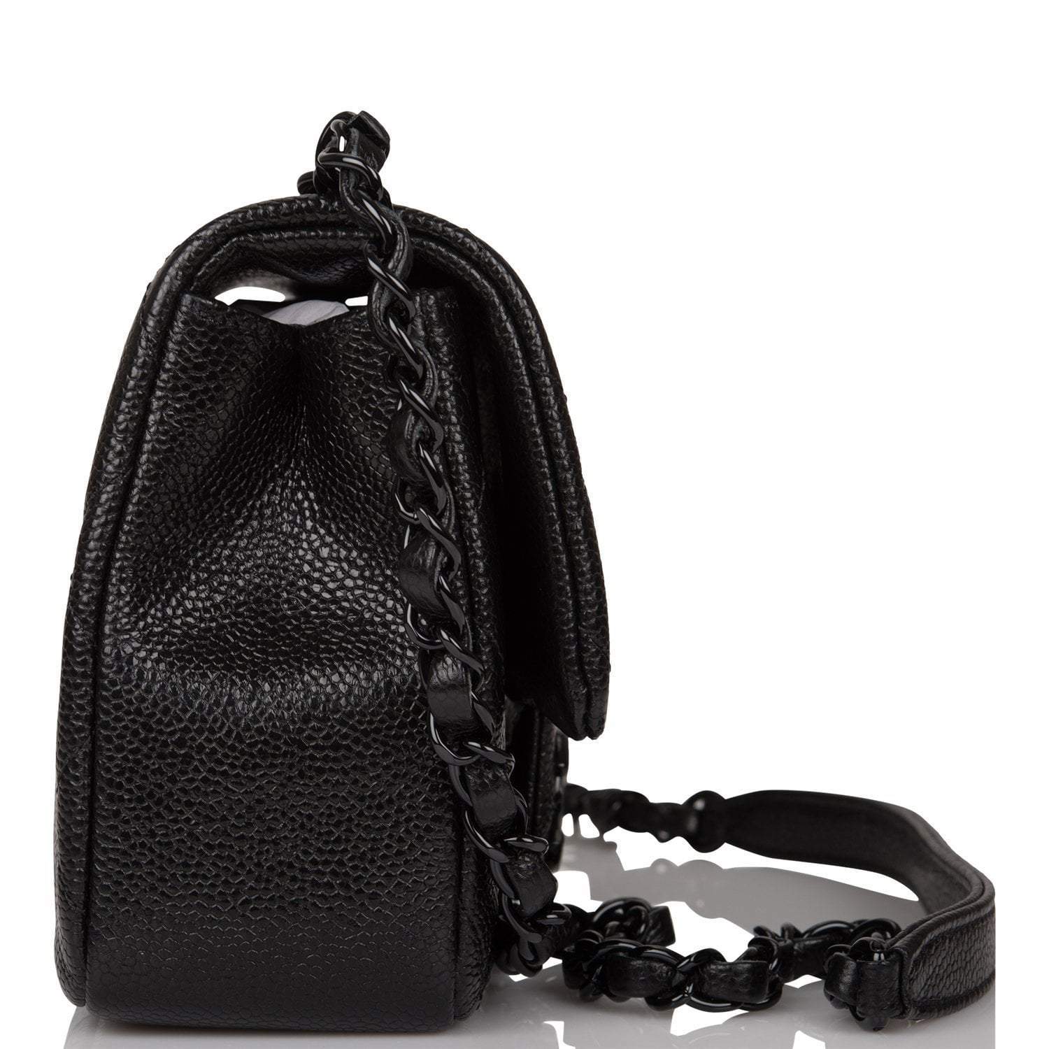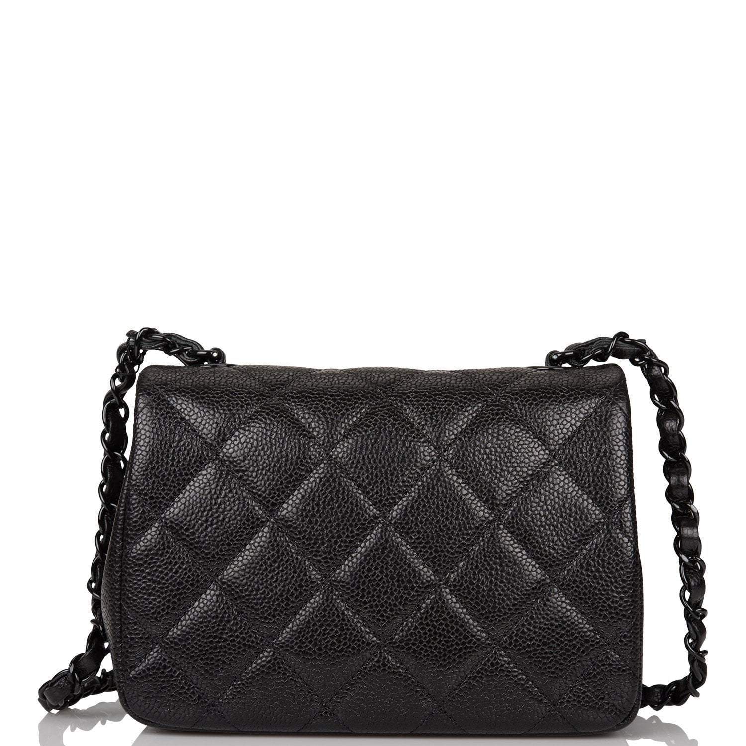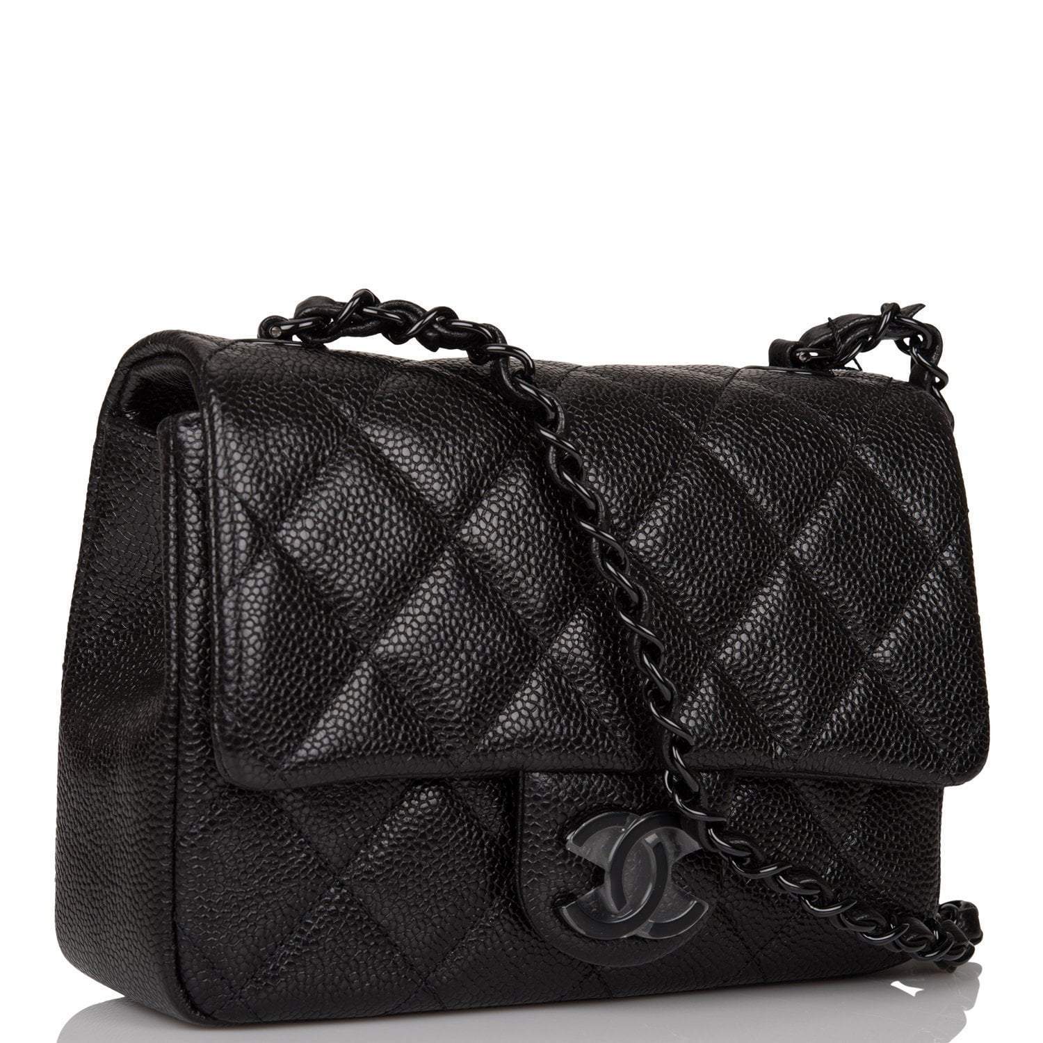 This Incognito Mini Square flap bag is in black caviar with black hardware and has a front flap with signature CC snap closure and single interwoven black leather and black chain link shoulder/crossbody strap.