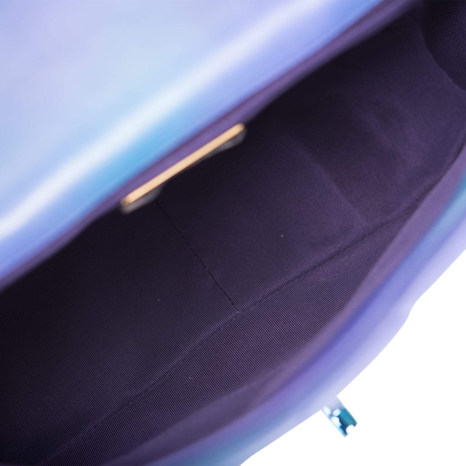 This Medium 19 Flap bag is of tie dye calfskin with rainbow hardware and has the signature diamond quilting, signature CC interlocking closure, exterior back pocket, chain top handle, and long rainbow metal and tie dye leather chain.