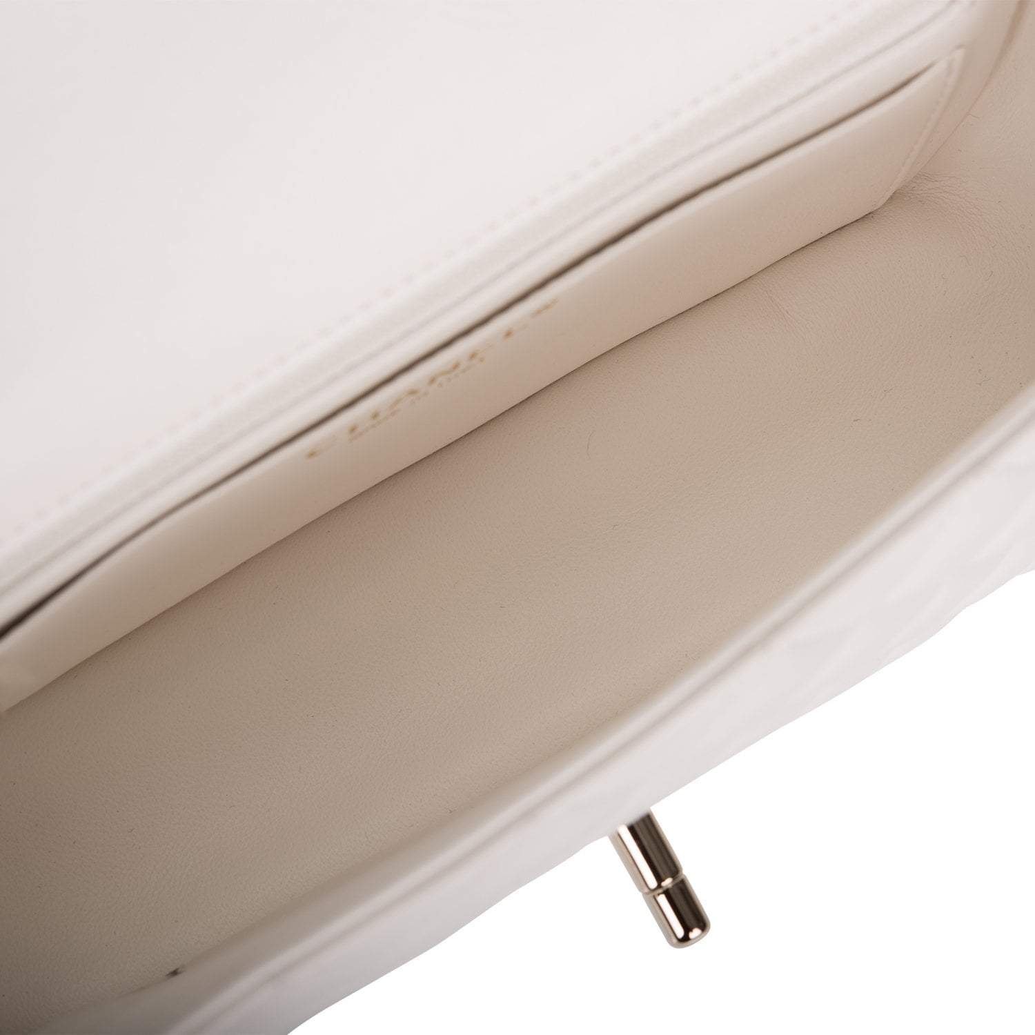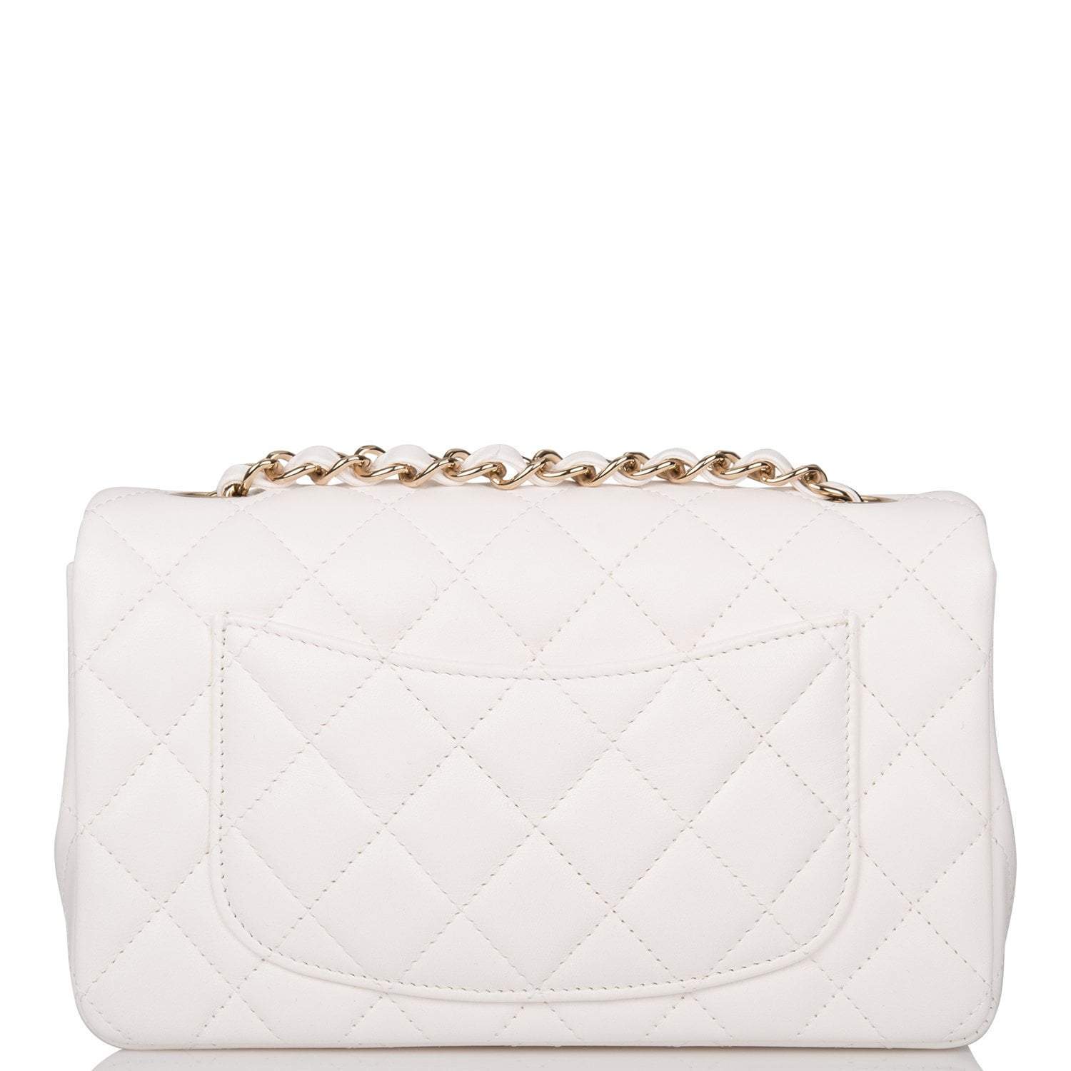 This Mini Rectangular flap bag is of white lambskin leather with light gold tone hardware and has a front flap with signature CC turnlock closure, rear half moon pocket, single interwoven white leather and light gold tone chain link shoulder/crossbody strap.