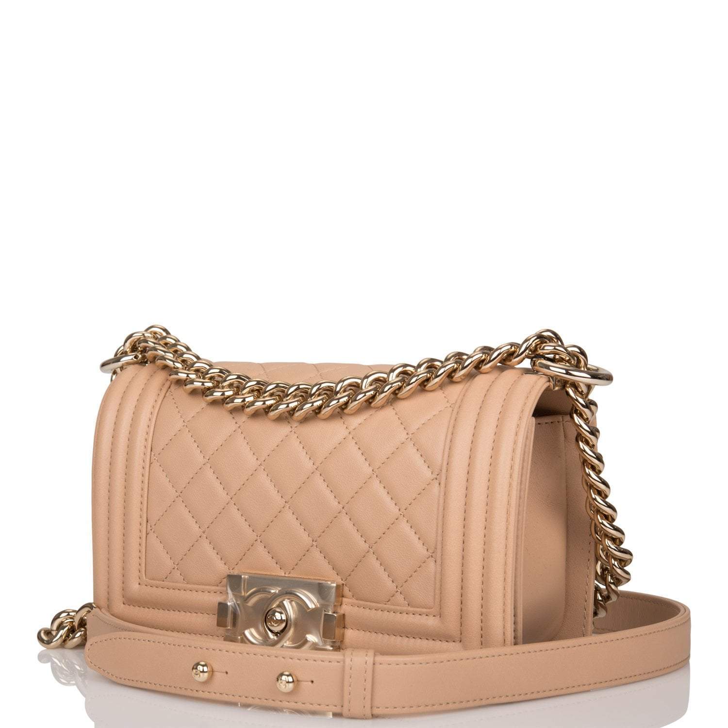 This Small Boy bag is in camel quilted lambskin leather with light gold tone hardware and features a full front flap with the Le Boy CC push lock closure and an light gold tone chain link and camel leather padded shoulder/crossbody strap.