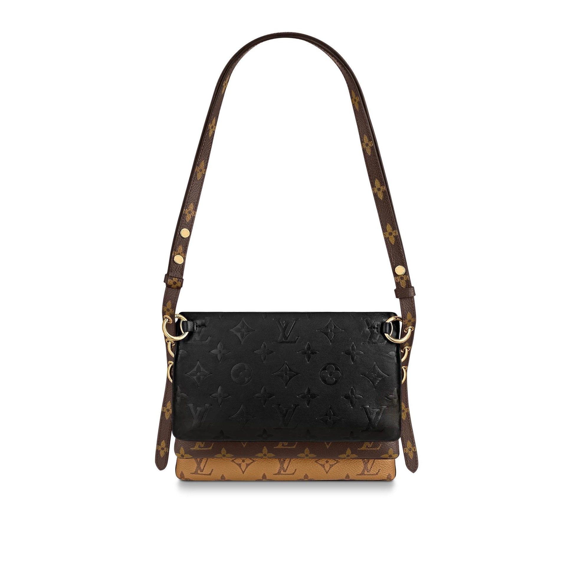 Nicolas Ghesquière introduces the LV3 Pouch, a playful grouping of three individual zipped pouches attached with metal rings, for the Prefall 2020. Fashioned from black lambskin with an embossed Monogram pattern, Monogram canvas, and Monogram Reverse canvas, the piece has an adjustable leather strap for shoulder or cross-body carry.
